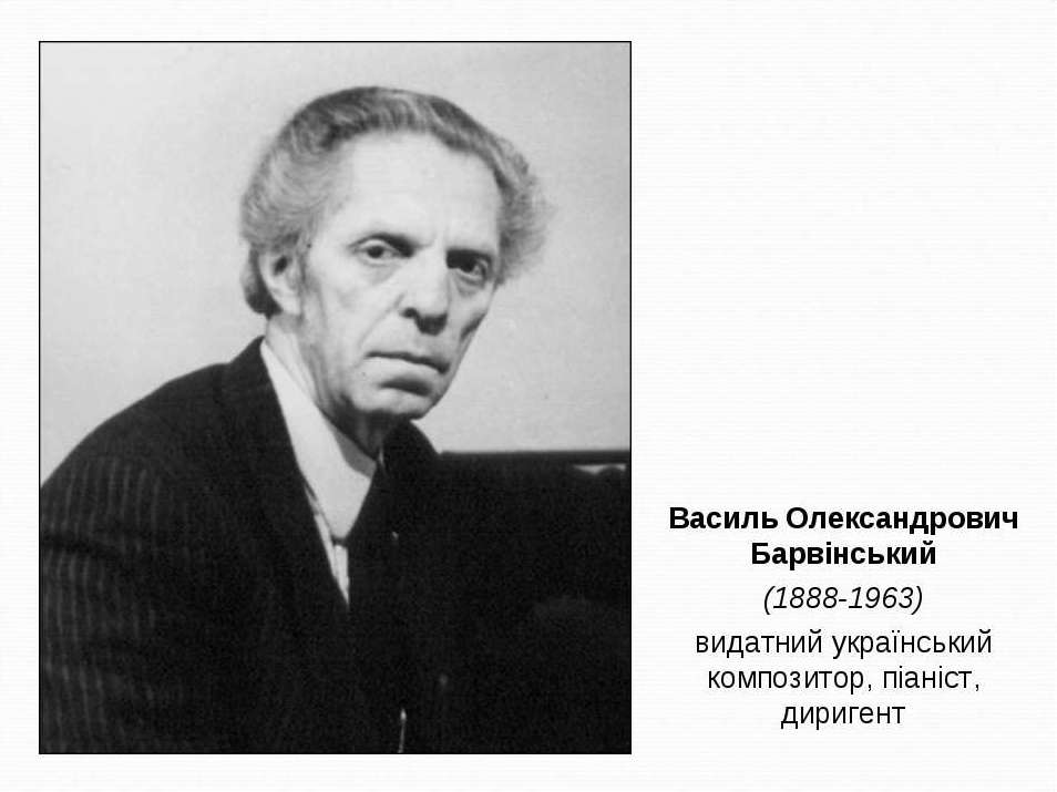 Василь Барвінський (1888-1963) був видатним композитором і музично-громадським діячем всеукраїнського та європейського значення. Його діяльність – це одна з найважливіших сторінок музичної історії Львова у ХХ столітті. 30 років він стояв на чолі української консерваторії. Своєю самовідданою діяльністю спричинився до розквіту української музики у Львові передвоєнного часу. І сьогодні рівнем музичної освіти і концертного життя, який ми маємо, великою мірою завдячуємо Василеві Барвінському.
