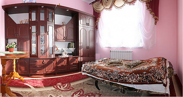 - Будинок на 10-14 місць. На першому поверсі - живуть господарі. На другому поверсі - 5 двомісних кімнат (двоспальне ліжко або розкладний диван, шафа для одягу, телевізор, у двох кімнатах є додаткові місця - 2 розкладні крісла), 2 санвузли на поверсі (душова кабіна, туалет, умивальник).