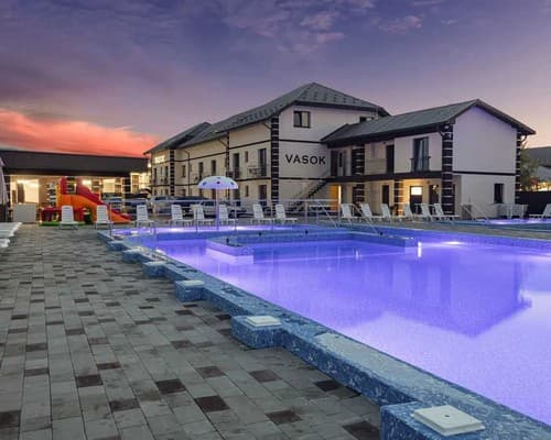 Готель "Vasok" розташований у самому серці курортного селища Солотвино, всього за кілька хвилин пішки від соляних озер та лікувальних басейнів. Гостям пропонуються комфортабельні номери обладнані: двоспальними, односпальними ліжками з постільною білизною, шафою, робочим столом, кондиціонером, телевізором, безкоштовним Wi-Fi. Санвузол укомплектований душовою кабіною, умивальником, туалетом, рушниками, косметичними засобами. На території готелю облаштовані альтанки, мангали, простора зона відпочинку, ресторан та парковка. До послуг гостей басейни з прісною та соленою водою, навколо яких є зона відпочинку з лежаками, тіньовими навісами та зеленими насадженнями. Відстань від готелю "Vasok" до центру селища складає 3,2 км, до автостанції - 3 км, до залізничної станції "Солотвино-1" - 3 км.