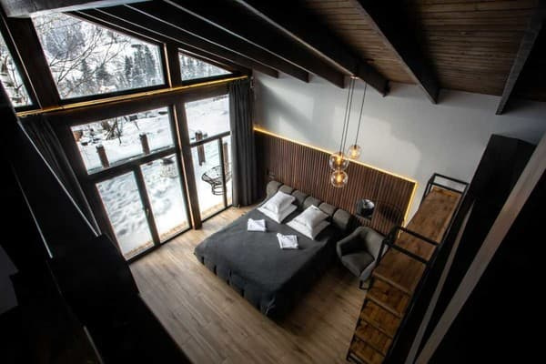 Готель "Вершина" розташований у курортному містечку Яремче, за 200 м від підйомника. Номерний фонд готелю представлений кількома категоріями номерів. До послуг гостей апартаменти для розміщення двох осіб та котеджі, для розміщення чотирьох осіб. У кожному номері є опалення, телевізор, шафа. Є кухня для приготування їжі, укомплектована всім необхідним. На території є паркувальні місця для автомобілів. Для дітей передбачено дитячий ігровий майданчик з батутом. Також на території є басейн (працює в літній сезон). Інтернет розповсюджується по всій території готелю. Подача холодної та гарячої води цілодобова. Проживання з тваринами до 3 кг можливе за попередньою домовленістю із внесенням застави. Відстань до готелю "Вершина" від автовокзалу – 5,7 км., від залізничного вокзалу – 5,2 км., від аеропорту – 61 км.