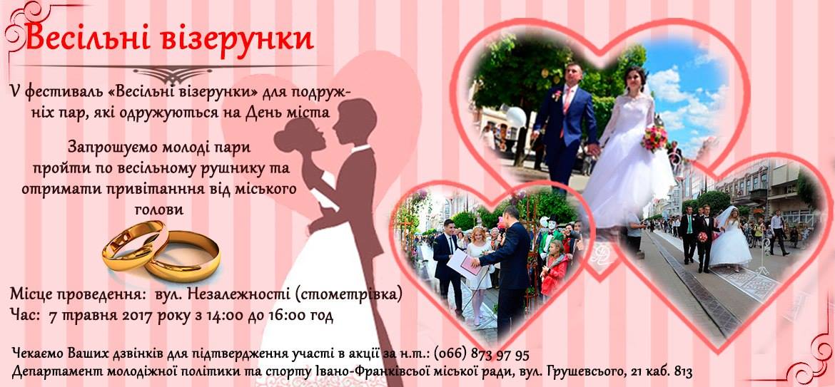7 травня в Івано-Франківську на вул. Незалежності, пішохідна частина навпроти стоматкорпусу, відбудеться V міський фестиваль «Весільні візерунки» для подружніх пар, які одружуються на День міста, організований департаментом молодіжної політики та спорту Івано-Франківської міської ради.