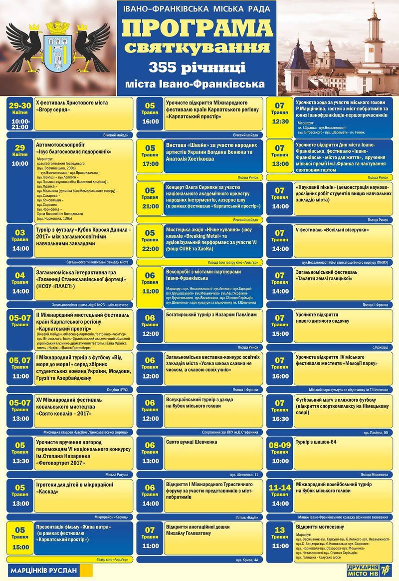 355-річчя Івано-Франківська обіцяють відсвяткувати доволі масштабно. Планується провести більше ста заходів, серед яких – костюмована хода містом, світлове шоу, концерт, велопробіг тощо.