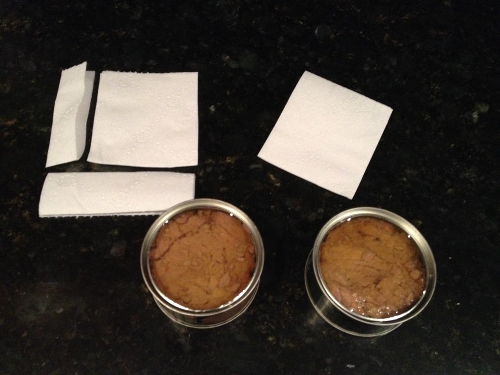 Відкриваєте банки з тунцем і складаєте паперові рушники або туалетний папір в декілька разів.