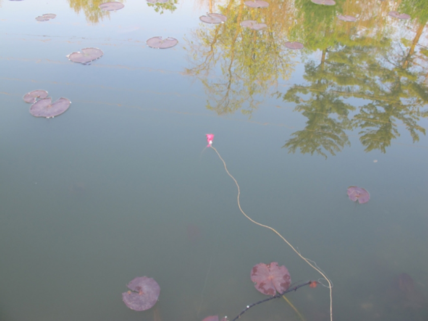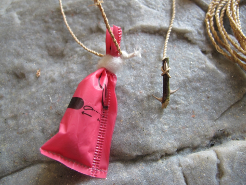 Коли під рукою є мотузка і саморобний гачок, вудочка вже майже готова. Залишилося сконструювати поплавок. Беремо упаковку від тампона. Розкриваємо, міцно перетягуємо край. Щоб повітря, що знаходиться всередині, не виходило, можна додати всередину, на місце перетяжки, трохи вати із самого тампона. Прив'язуємо до нашої "жилки":