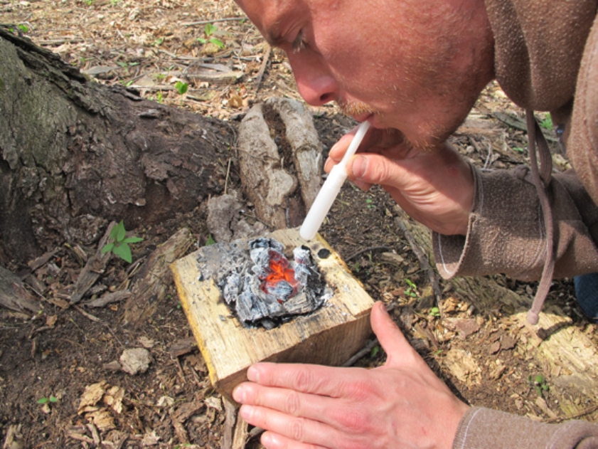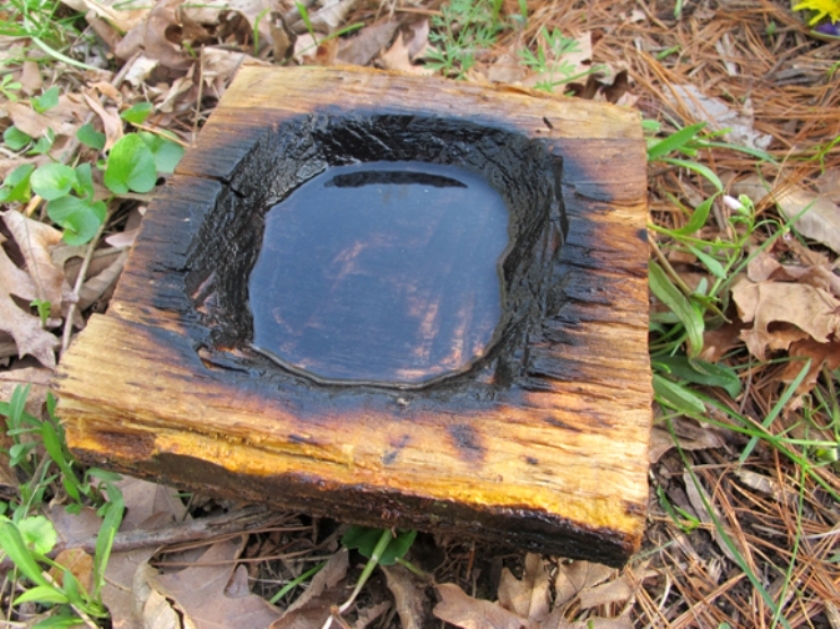 Беремо порожній пластиковий аплікатор від тампона, роздмухуємо вугілля на шматку колоди. Випалюємо відповідного розміру ємність. У автора пішло близько 30 хвилин на те, щоб спорудити контейнер, що вміщає 2 чашки води.