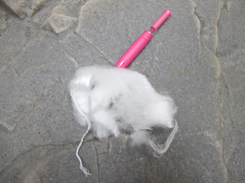 Витяжний шнур тампона (мотузочка по центру) може послужити фітілем для імпровізованої свічки. На фото нижче в якості наповнювача використаний тваринний жир: