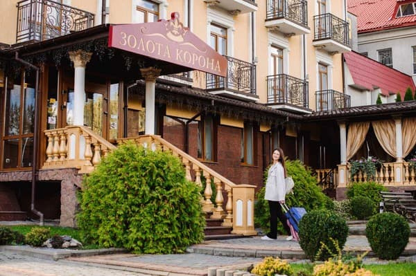 Затишний готель "Золота Корона" розташований поблизу центральної частини бальнеологічного курорту Трускавець, в 900 м від центрального бювету лікувальних вод Трускавця. До послуг гостей номери категорії "Стандарт" і дворівневий "Люкс" з джакузі і сауною, оформлених в теплих тонах. В кожному номері є сейф і всі необхідні зручності для вашого перебування. Ресторан готелю пропонує страви української та європейської кухні, а також комплексні обіди і вечері. Для зручності гостей передбачені безкоштовні послуги парковки, бювет мінеральних вод «Нафтуся» і «Марія», Wi-Fi доступу і кімната для прасування. В готелі щоденна доставка мінеральної води з основного бювету Трускавця. До послуг клієнтів за додаткову плату, готель пропонує: пральню, лікувальний і релаксуючий масаж, організацію кейтерінгу, послуги трансферу та екскурсії по Україні. Проживання із тваринами до 10 кг платне, можливе за попередньою домовленістю із готелем, вартість уточнювати при кожному бронюванні. Поряд з готелем розташований лікувально-діагностичних центр. Відстань до залізничного вокзалу - 800 м.